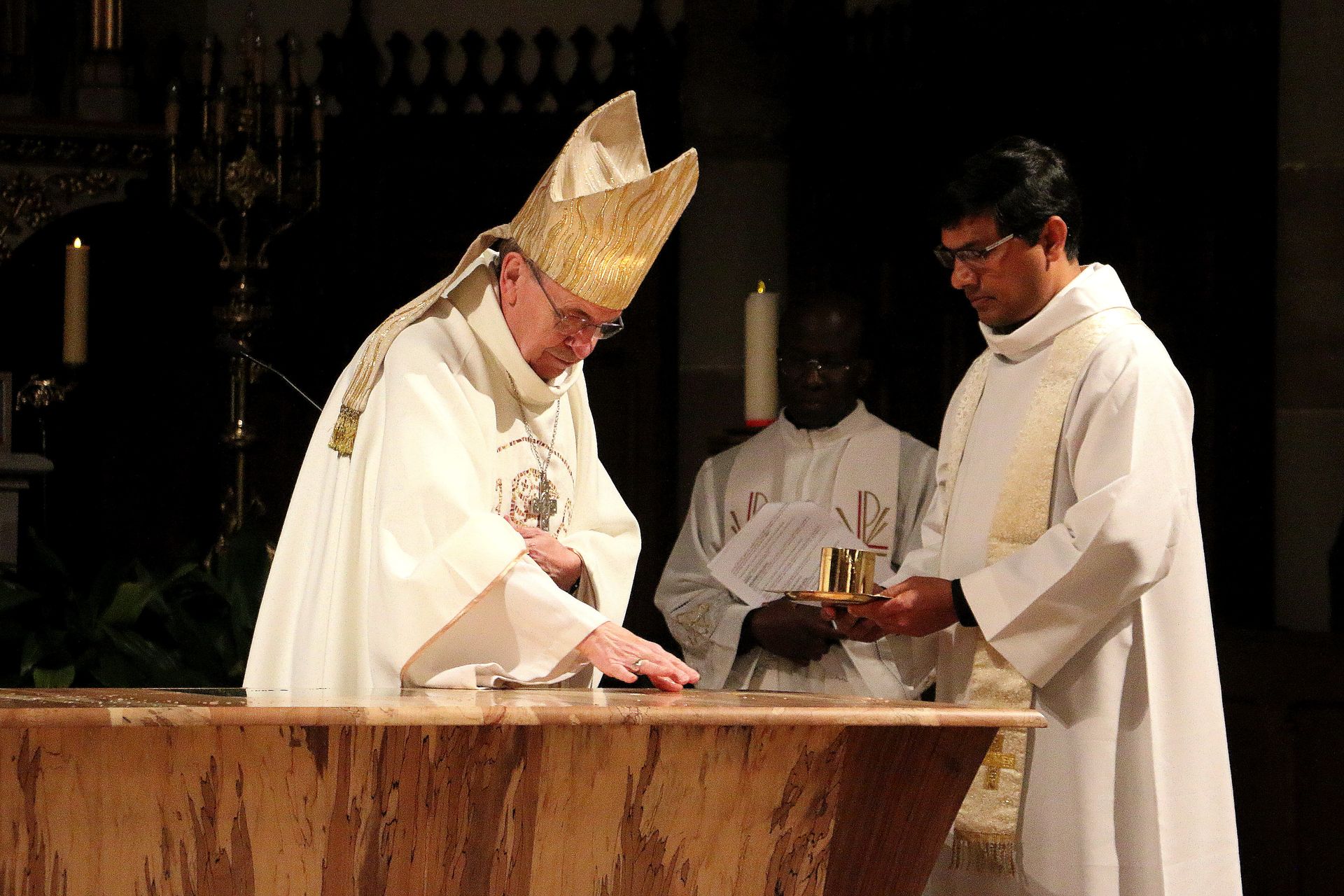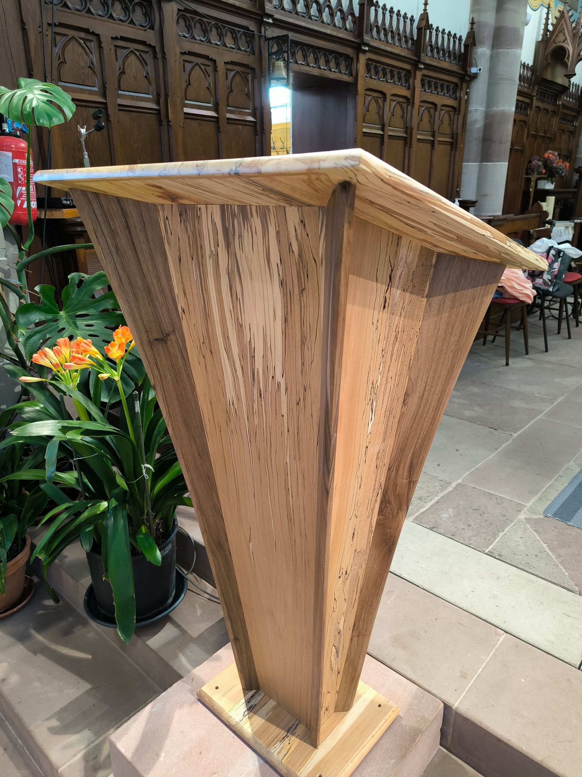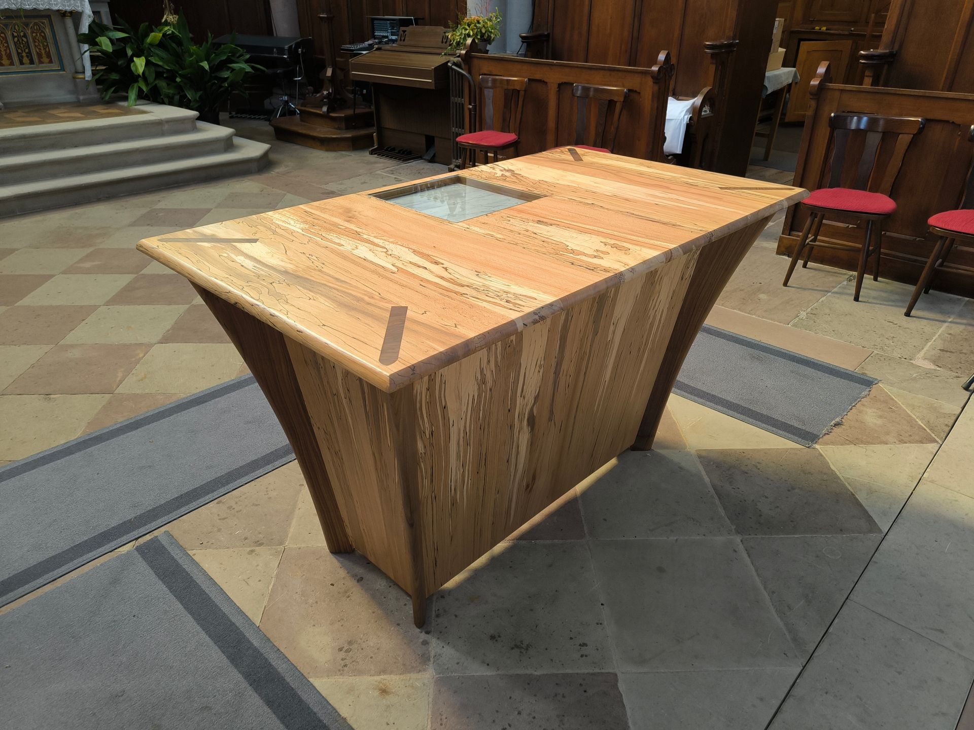 Fabrication d'un Ambon et un Autel en noyer noir d'Alsace massif et hêtre échauffé, les pieds sont en forme d'ogive, le plateau montre dans un tiroir une pierre eucharistique, les pieds remontent et sont donc incrustés en bois de bout.