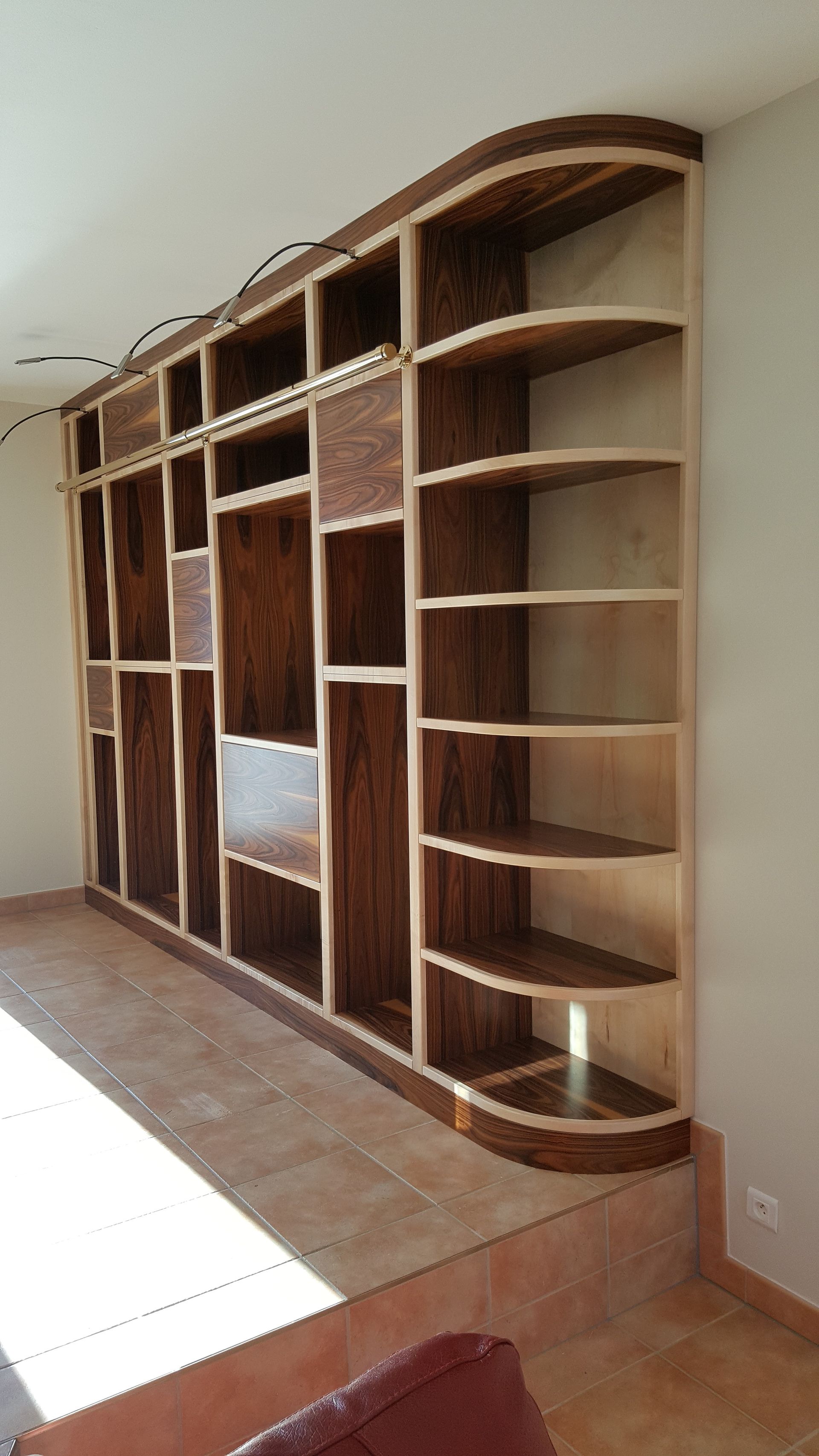 Bibliothèque sur-mesure en placage palissandre de Santos et érable massif