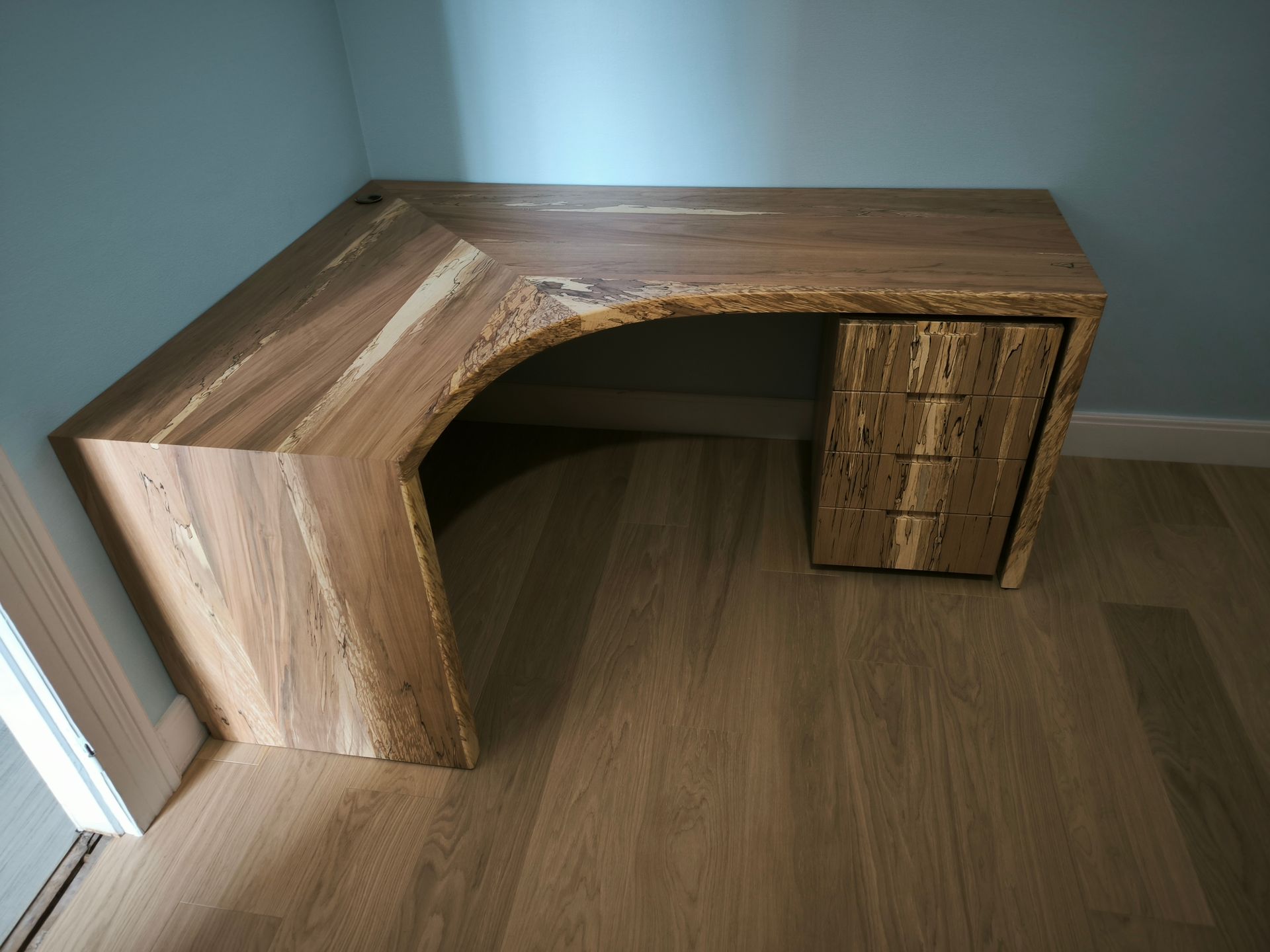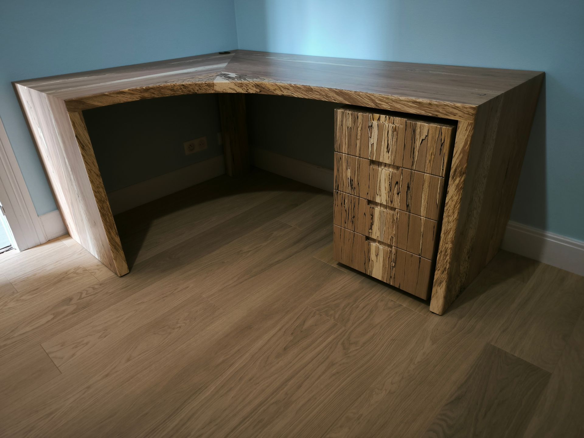 Bureau de coin 4 tiroirs en hêtre flammé massif.