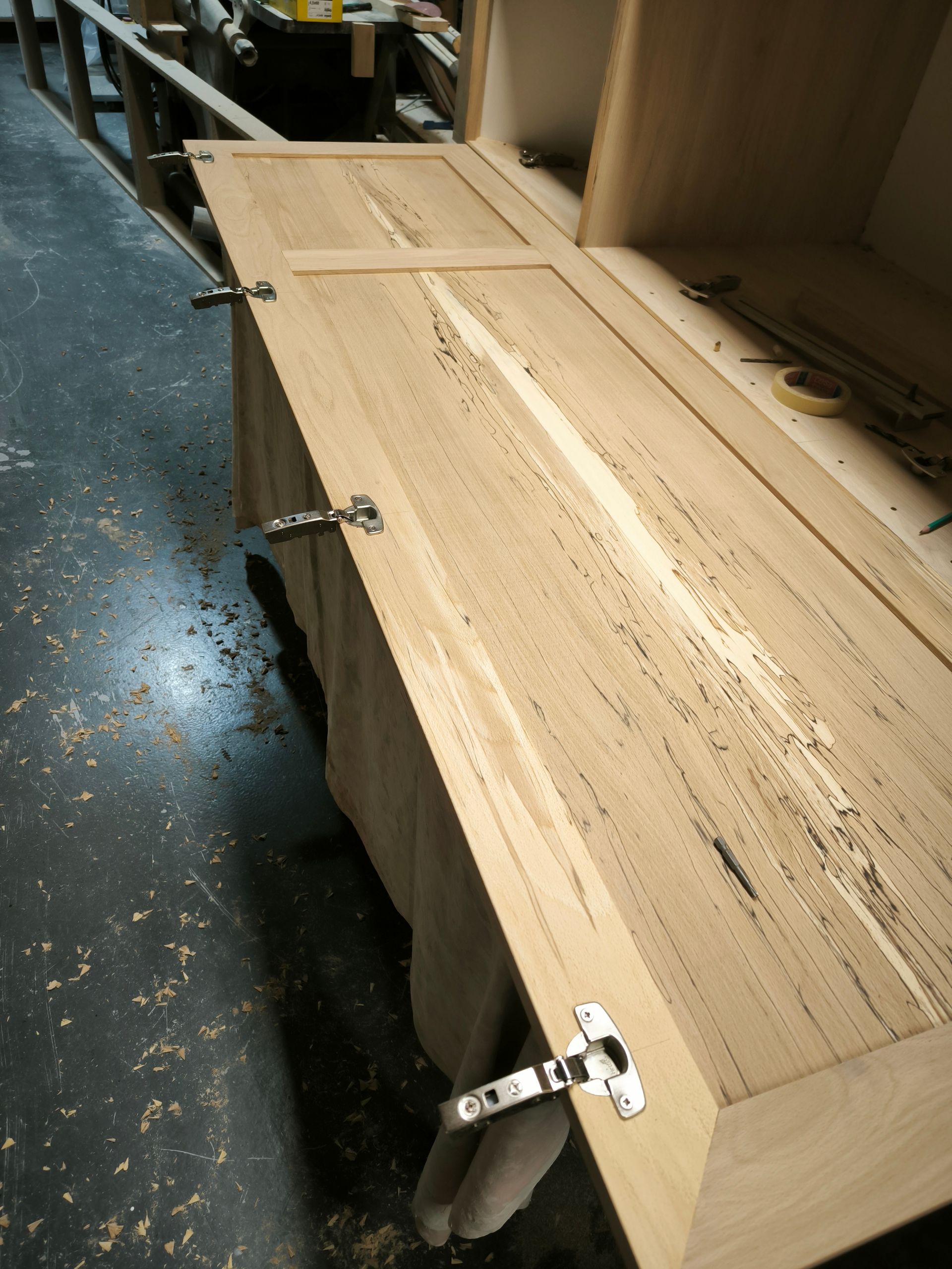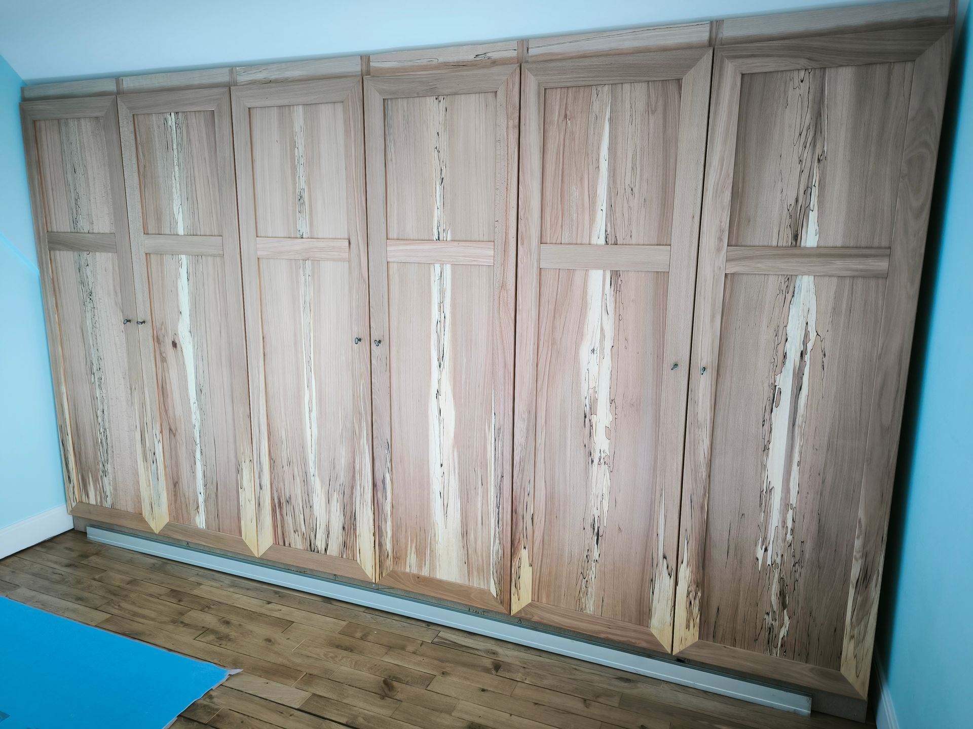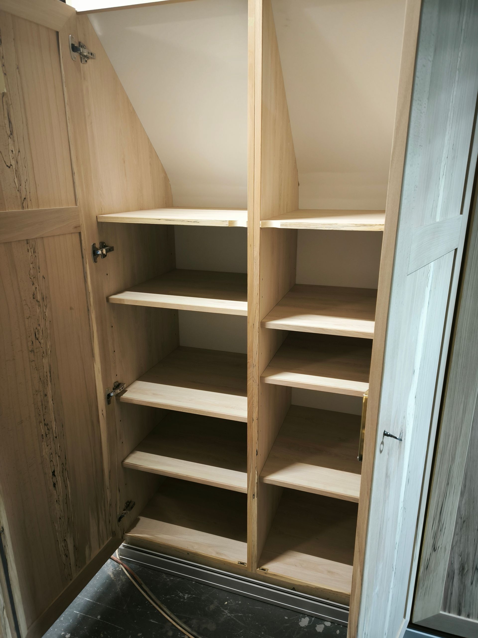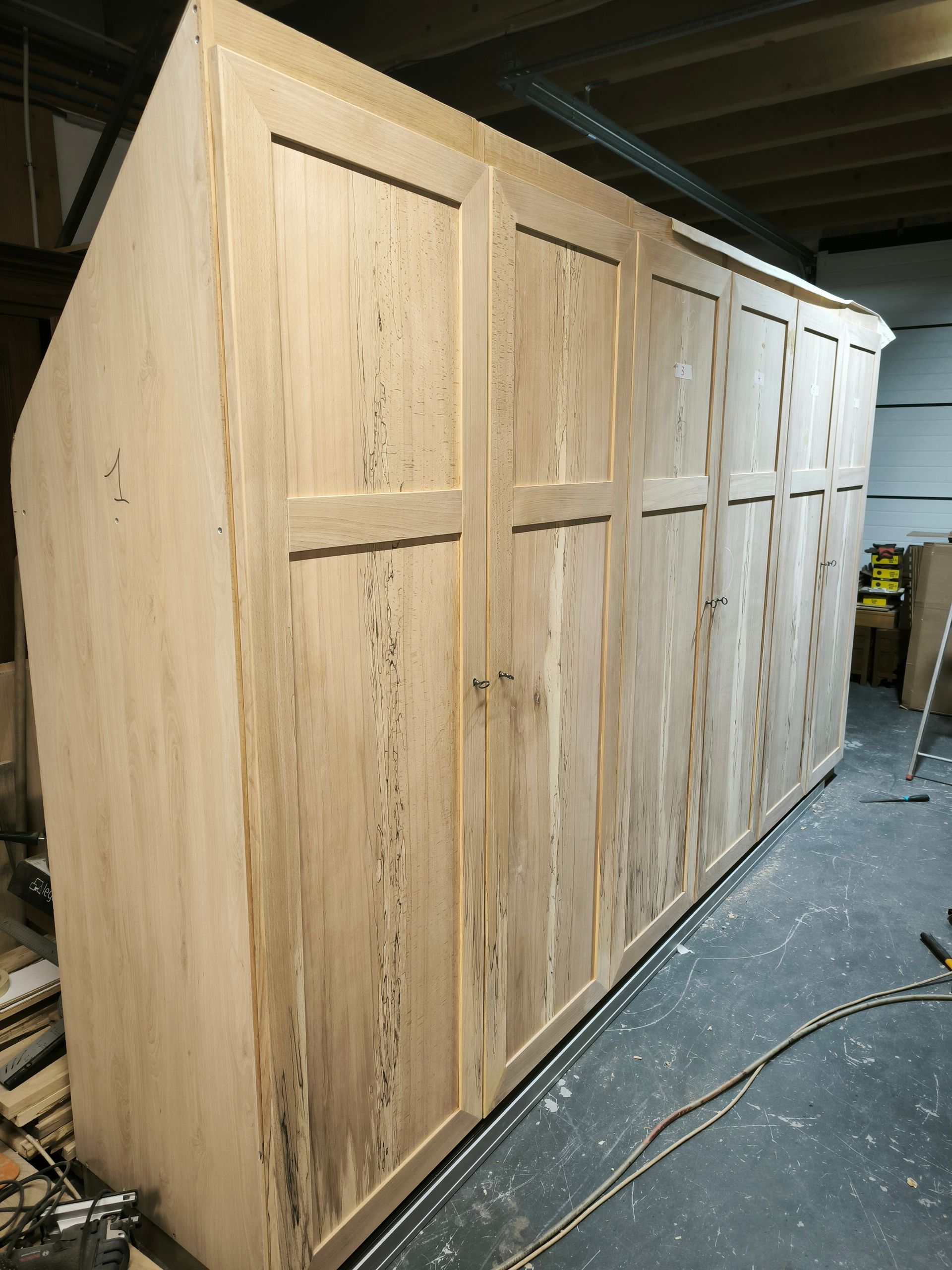 Portes en hêtre massif flammé, assemblage tenons mortaises avec charnières invisibles, fermeture a clef avec crémone laiton massif et acier.